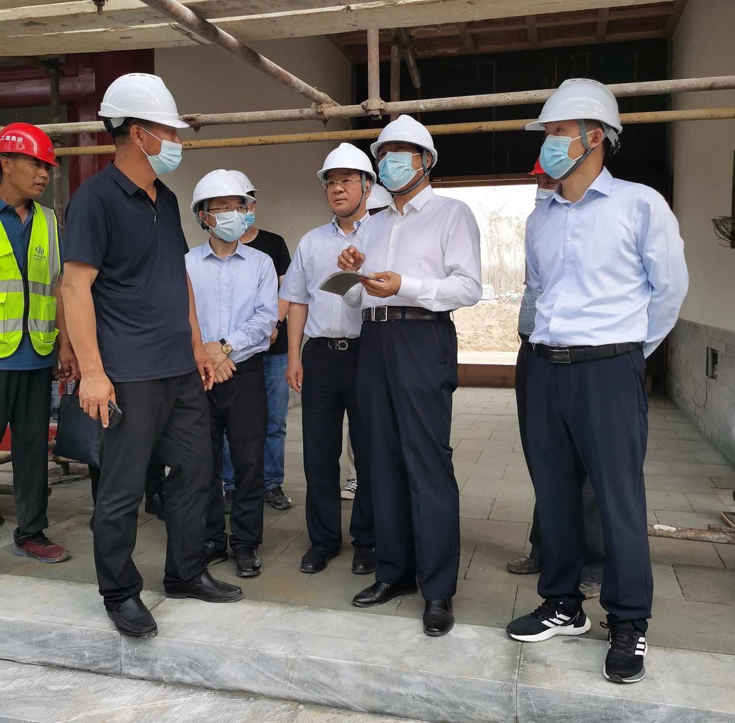 张建军董事长向吴清海书记汇报了雄安郊野公园承德园的规划设计、功能布局、工程建设等有关情况后,吴清海书记一行实地踏查了承德展园施工现场。