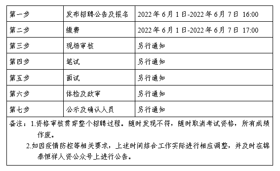 (二)体检时间、地点及注意事项在“锦泰恒祥人资公众号”进行通知。